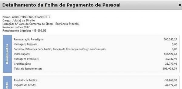 A remuneração de R$ 503.928,79 paga em julho ao juiz Mirko Vincenzo Giannotte, da 6ª Vara de Sinop (MT), foi um dos principais assuntos da semana ao redor do país. Dados publicados no Portal da Transparência com detalhes sobre o subsídio mensal geraram debate por conta da quantia – considerada “vultuosa” até pelo CNJ (Conselho Nacional de Justiça), que disse não ter autorizado pagamentos deste porte no Estado.