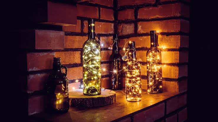 As garrafas podem ser pintadas, usadas como vasos ou suporte para luzes de pisca-pisca. Com flores secas, viram arranjos delicados que combinam com qualquer estilo.