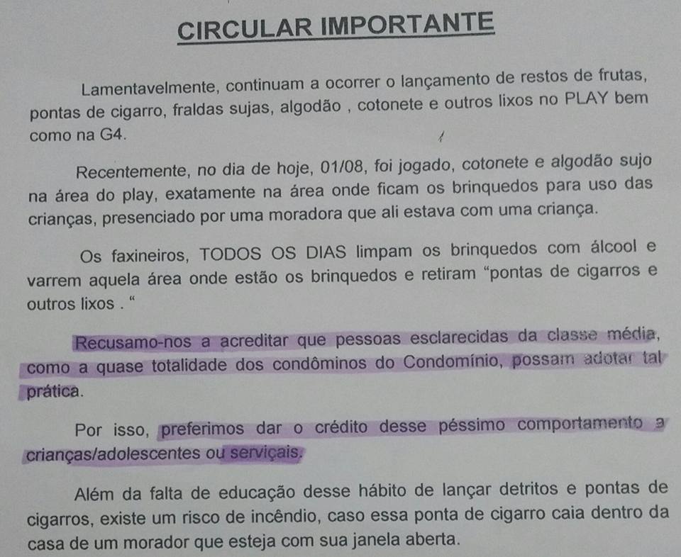 O texto prossegue com as seguintes frases: “Recusamo-nos a acreditar que pessoas esclarecidas da classe média como a quase totalidade dos condôminos do Condomínio, possam adotar tal prática. Por isso, preferimos dar o crédito desse péssimo comportamento a crianças/adolescente ou serviçais”.