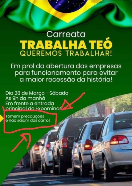 Na divulgação da carreata, agendada para este sábado, 28, às 9h, junto com a palavra de ordem ‘Queremos trabalhar’, vem uma orientação tão ou mais importante: