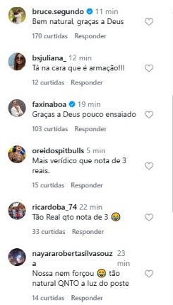 “Bem natural, graças a Deus”, diz um usuário do Instagram. Outros afirmam que “está na cara que é armação”, “tão real quanto nota de R$ 3” e sugerem que o episódio foi “ensaiado”.