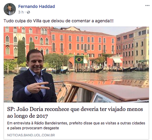 “Culpa do Villa que não comenta a agenda”, diz Haddad sobre Doria ter reconhecido que viajou demais em 2017