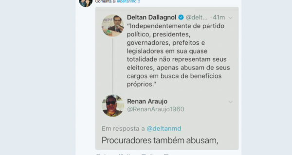 O procurador Deltan Dallagnol, coordenador da Operação Lava Jato, posta nota no Twitter com o discurso anti-corrupção: “Independentemente de partido político, presidentes, governadores, prefeitos e legisladores em sua quase totalidade não representam seus eleitores, apenas abusam de seus cargos em busca de benefícios próprios”.