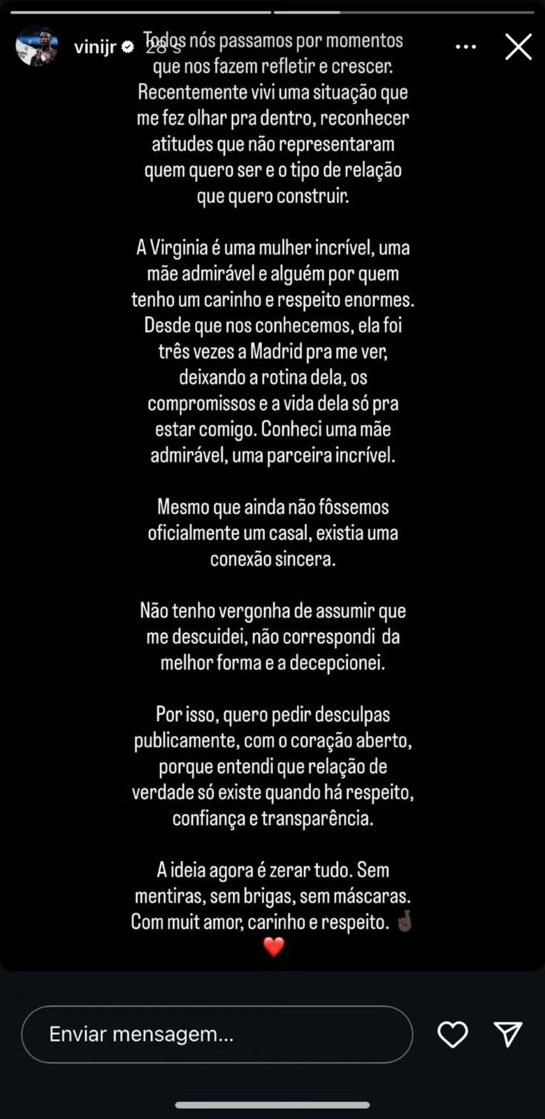 Ele relatou dedicação de Virginia e assumiu que a decepcionou. “Desde que nos conhecemos, ela foi três vezes a Madri pra me ver, deixando a rotina dela, os compromissos e a vida dela só pra estar comigo. Conheci uma mãe admirável, uma parceira incrível. Mesmo que ainda não fôssemos oficialmente um casal, existia uma conexão sincera. Não tenho vergonha de assumir que me descuidei, não correspondi da melhor forma e a decepcionei”, completou.