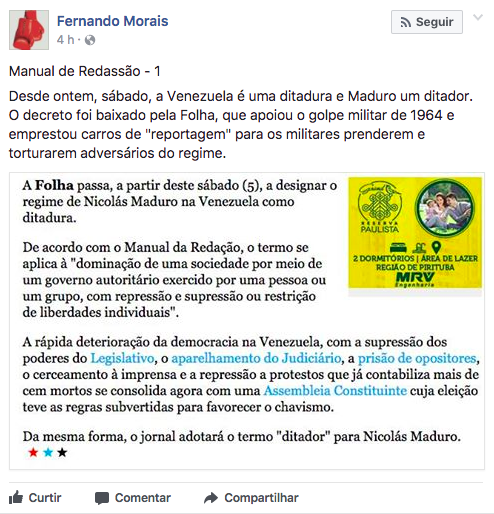 “Decreto” da Folha que chama Maduro de ditador vem de jornal que emprestou carros para a ditadura, diz Fernando Morais