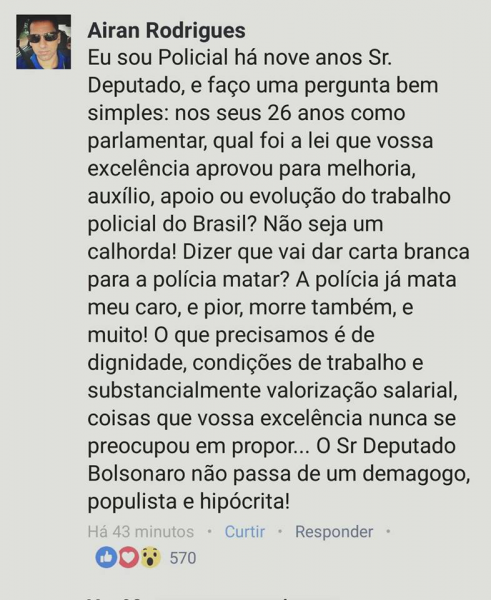 O policial Airan Rodrigues deixou o seguinte comentário na conta de Facebook do deputado e candidato a presidente Jair Bolsonaro: