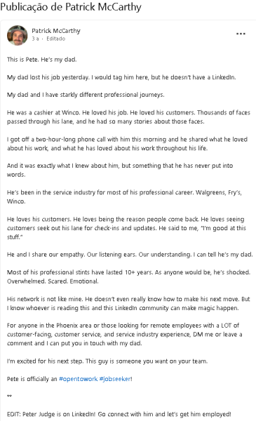 Patrick McCarthy, filho d Peter Judge, usou sua conta no LinkedIn para compartilhar a história comovente sobre a demissão do pai, que havia trabalhado por quase quatro anos como caixa na WinCo Foods, em Phoenix, EUA. Após ser demitido devido a questões de licenças médicas e atrasos, Patrick publicou um texto repleto de amor e carinho, destacando a dedicação do pai ao seu trabalho e aos clientes. O post se tornou viral e gerou uma chuva de ofertas de emprego para Peter.