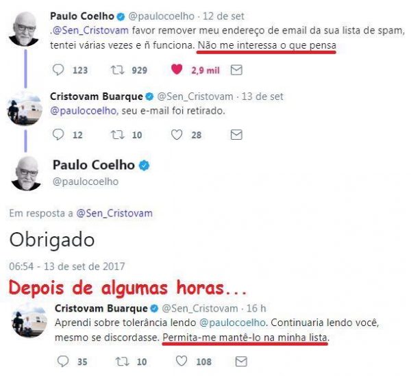Depois de treta no twitter, Cristovam Buarque insiste em mandar spam para Paulo Coelho