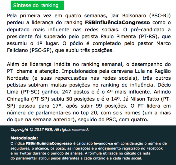 O índice é calculado levando-se em consideração o número de seguidores, o alcance, os posts, as interações e o engajamento registrado no Facebook e no Twitter durante o período de análise. A fórmula utilizada no cálculo da nota do parlamentar atribui pesos diferentes a cada critério e a cada rede social.
