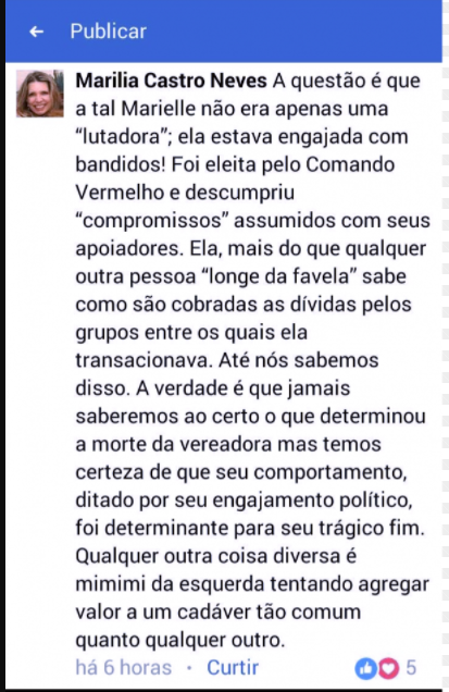 Desembargadora do Tribunal de Justiça do Rio de Janeiro, ex-procuradora do Estado que entrou no TJ pelo quinto constitucional, em postagem no Facebook Marília Castro Neves acusou Marielle Franco de ter pertencido ao Comando Vermelho.