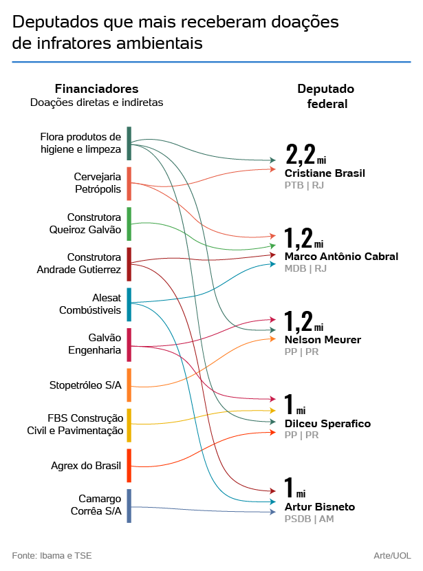 Receber essas doações não é crime nem é vedado pela Justiça Eleitoral. Mas a grande proporção de financiadores-infratores pode chamar a atenção, em especial quando se trata de uma legislatura que aprovou projetos criticados por seus impactos ao meio ambiente. Caso da “MP da Grilagem”, como ficou conhecida a medida provisória que facilita a regularização de áreas públicas invadidas. Assim como das votações que reduziram a proteção da Floresta Nacional do Jamanxim (PA) e de dois parques nacionais.