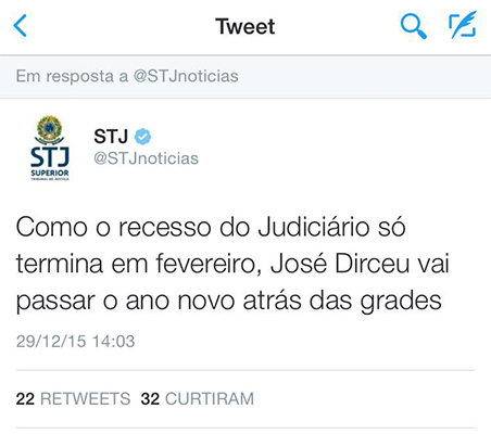 O tweet foi redigido após o presidente do STJ, Francisco Falcão, adiar decisão em um habeas corpus impetrado por Dirceu, determinando que o Ministério Público se manifestasse antes do exame do recurso. Na prática, o despacho determina que a análise do caso só ocorra após o recesso do Judiciário, em fevereiro.