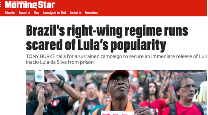 Em artigo de uma página no jornal britânico “The Morning Star” , o colunista Tony Burke afirma que Lula foi preso por uma farsa montada para evitar que ele voltasse a ser presidente do Brasil. “Isso não teria sido permitido pelo sistema judicial britânico, europeu ou americano”, denuncia.