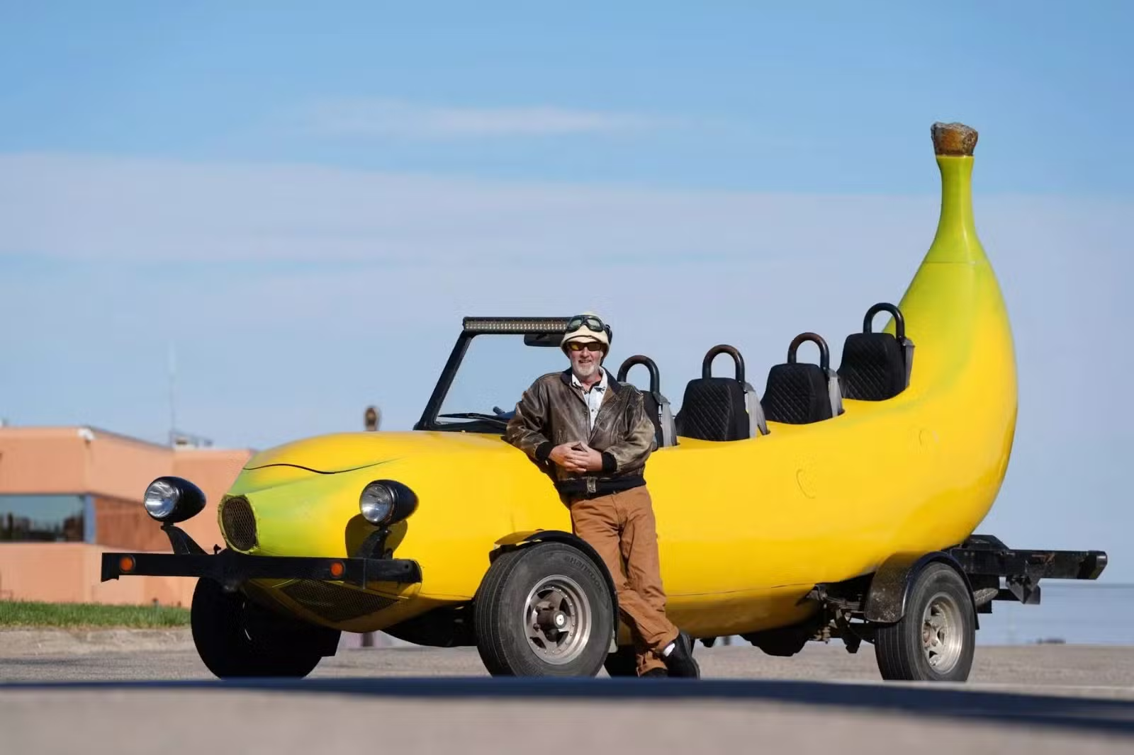 Steve Braithwaite, “Banana Car Man”(Reino Unido) — construiu o maior carro banana personalizado do mundo, com 6,97 metros de comprimento, pintado como fruta gigante sobre rodas. — Foto: Divulgação/Guinness World Records