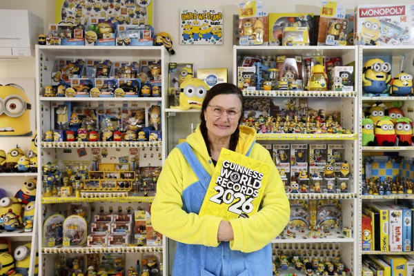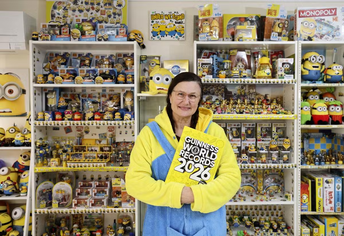 Liesl Benecke (Austrália) — residente de Jindalee, ganhou destaque ao atingir o recorde de maior coleção dos Minions, com 1.035 itens, acumulando ímãs, brinquedos e souvenires da franquia. — Foto: Divulgação/Guinness World Records