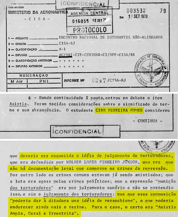 “O estudante Ciro Ferreira Gomes considerou que deveria ser esquecida a ideia de julgamento de torturadores […] uma vez que não há documentação legal que comprove os crimes da repressão”, diz um trecho do documento.