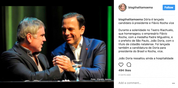 Em seu Instagram pessoal, o empresário Flavio Rocha, acionista da Riachuelo, postou um texto em que lançava a candidatura de João Doria a presidente e a sua como vice.