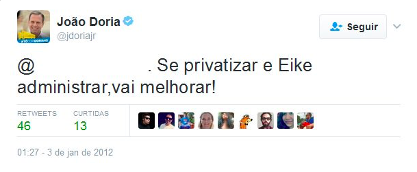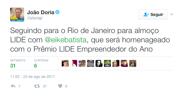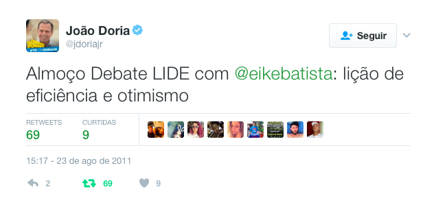 O prefeito de São Paulo, João Doria, está apagando a toque de caixa elogios a Eike Batista em sua conta no Twitter.