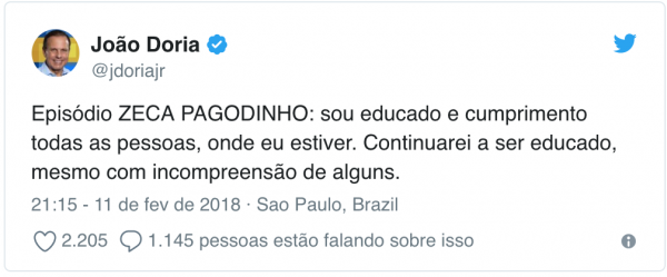 A saia justa virou um dos temas mais comentados nas redes sociais nas últimas horas e rendeu vários memes ao longo deste domingo (11). Agora no final da noite, Doria usou o Twitter para quebrar o silêncio sobre o episódio. “Sou educado e cumprimento todas as pessoas, onde eu estiver”, disse o prefeito. Confira: