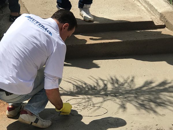 O prefeito de São Paulo, João Doria (PSDB), rabiscou mensagem em uma calçada recém-reformada na manhã deste domingo (3) durante ação de zeladoria da própria prefeitura. Em cimento ainda molhado, o tucano escreveu: “Viva SP – J. Doria. 12/17”.
