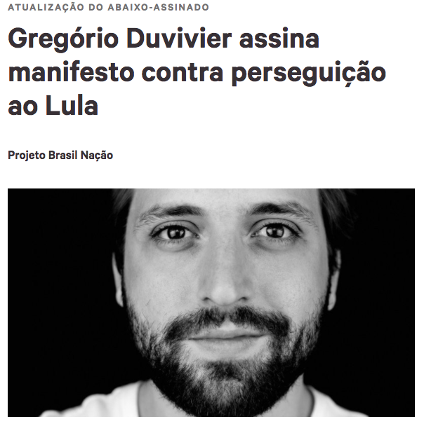 Gregório Duvivier, ator, humorista, roteirista e escritor brasileiro, um dos criadores do portal de humor Porta dos Fundos, aderiu nesta sexta-feira ao manifesto ELEIÇÃO SEM LULA É FRAUDE!