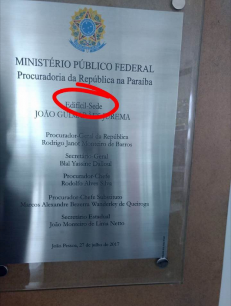 O erro é real e foi admitido pela administração do Ministério Público Federal na Paraíba, que informou já ter trocado a placa por uma corrigida e está “levantando informações sobre o que aconteceu na confecção da placa” anterior. O órgão, entretanto, afirma que “o arquivo que saiu do órgão para a empresa, por e-mail, estava sem erro” e vai instaurar um procedimento para apurar a correta execução do que foi contratado.
