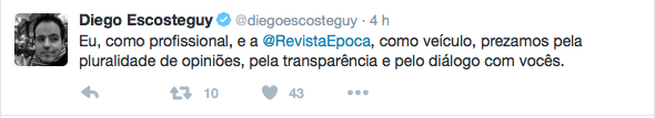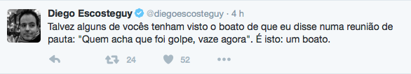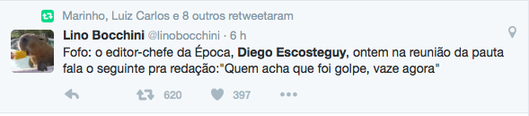 O jornalista Lino Bocchini publicou no Twitter que Diego Escosteguy, editor-chefe da Época, ameaçou demitir numa reunião quem de sua equipe dissesse que o golpe foi golpe.