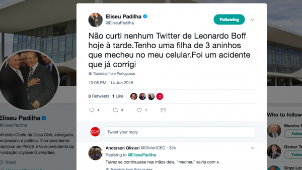 O ministro Eliseu Quadilha, ops, Padilha, quis fazer uma ironia com o teólogo Leonardo Boff e se deu mal. Mostrou que, além de não tratar bem o dinheiro público, castiga a Língua Portuguesa. “Não curti nenhum Twitter de Leonardo Boff hoje à tarde. Tenho uma filha de 3 aninhos que mecheu (sic) no meu celular. Foi um acidente que já corrigi”, disse, querendo ser engraçado. Um seguidor de sua conta não perdoou: