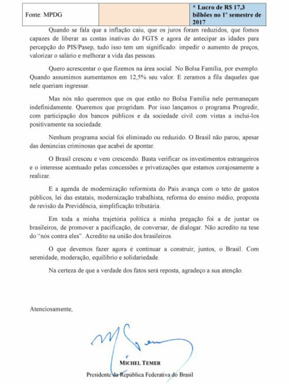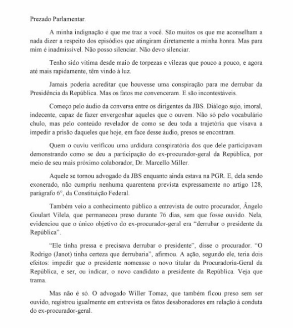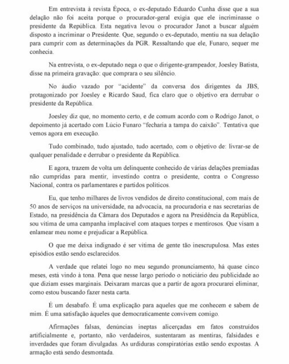 Ao longo de quatro páginas, Temer cita os áudios das conversas entre os dirigentes da JBS Joesley Batista e Ricardo Saud e diz que neles fica claro que o objetivo era derrubar o presidente da República. Faz menção também à delação premiada do doleiro Lúcio Funaro, cujos vídeos foram divulgados pela imprensa nos últimos dias. “Agora trazem de volta um delinquente conhecido de várias delações premiadas não cumpridas para mentir, investindo contra o presidente, contra o Congresso Nacional, contra os parlamentares e partidos políticos”, defende na carta.