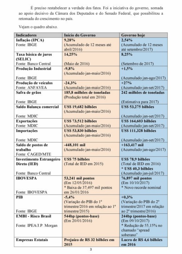 Temer finaliza o texto citando dados positivos da economia como a redução da inflação, criação de emprego e ações como a aprovação da reforma trabalhista. Ele diz aos parlamentares que a retomada do crescimento no país foi alcançada com o “apoio decisivo” da Câmara e do Senado.