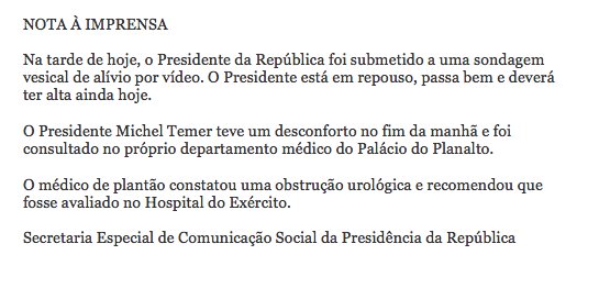 Em nova nota, o Planalto informa que Michel Temer passou por sondagem vesical de alívio — leia-se a introdução de sonda pela uretra — e passa bem.