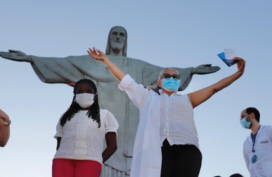 Rio – A idosa Terezinha da Conceição, de 80 anos, e a técnica em enfermagem do Hospital Municipal Ronaldo Gazolla Dulcinea da Silva Lopes, 59 anos, foram as primeiras cariocas a serem vacinadas com a CoronaVac, diante do Cristo Redentor.