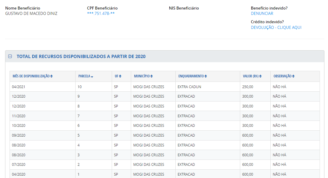 Segundo o Portal da Transparência, Diniz recebeu o benefício entre abril de 2020 e abril de 2021. Ao todo, ele recebeu R$ 5.450.