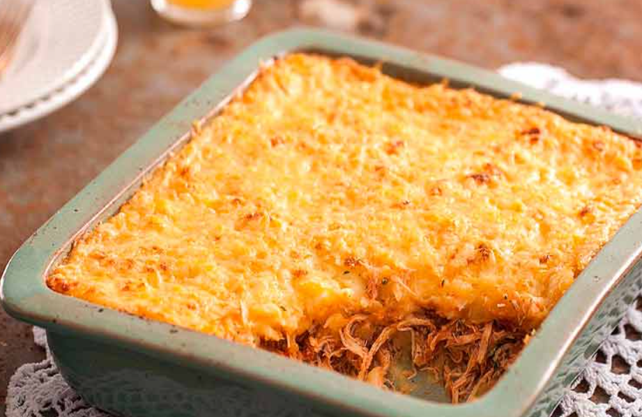 Escondidinho de frango com purê de mandioca gratinado