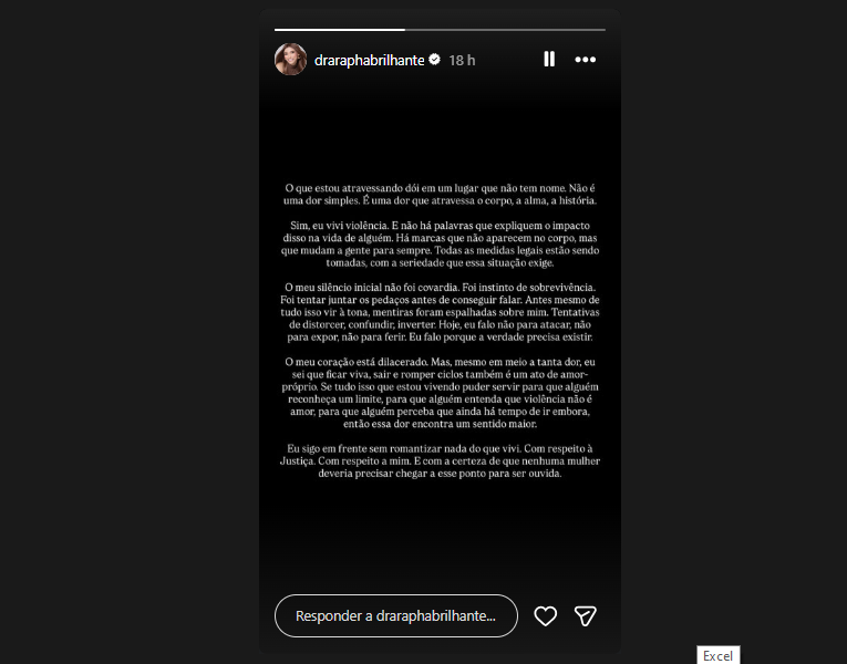 A influenciadora disse ainda que o silêncio inicial não foi “covardia”, mas “instinto de sobrevivência”, e que enfrentou tentativas de distorção dos fatos. “Eu falo porque a verdade precisa existir”, afirmou. Ao final, destacou que todas as medidas legais estão sendo tomadas “com respeito à Justiça” e reforçou que “nenhuma mulher deveria precisar chegar a esse ponto para ser ouvida”.