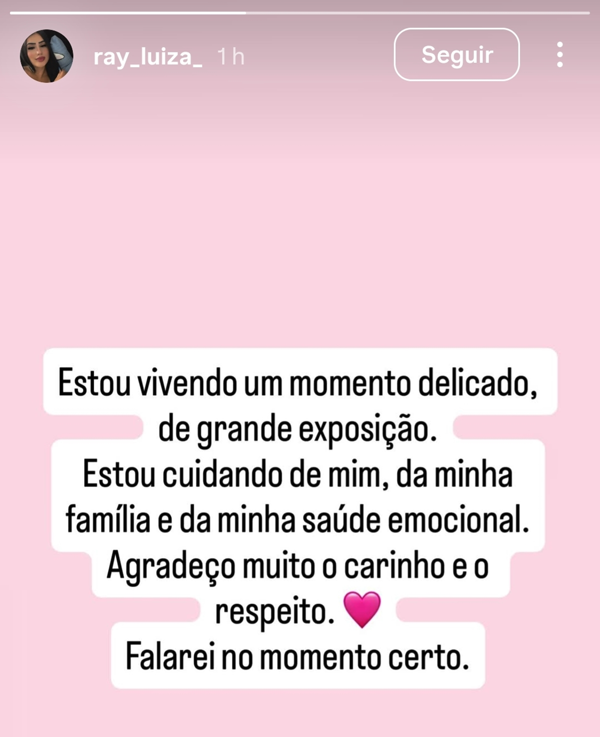 Na publicação, Rayna Luiza escreveu: “Estou vivendo em um momento delicado, de grande exposição. Estou cuidando de mim, da minha família e da minha saúde emocional. Agradeço muito o carinho e o respeito. Falarei no momento certo”.