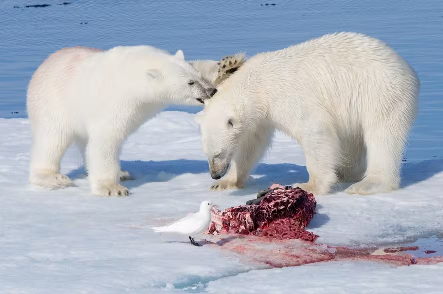 Um novo estudo publicado na revista Oikos revela que os ursos polares fornecem cerca de 7,6 milhões de quilos de carcaças de focas para outras espécies anualmente. Ao caçar no gelo marinho e consumir apenas a gordura mais energética, eles deixam para trás restos que alimentam pelo menos 11 espécies, como raposas-do-ártico e corvos. “Nossas descobertas quantificam, pela primeira vez, a enorme escala do papel dos ursos polares como fonte de alimento para outras espécies”, afirma a bióloga Holly Gamblin, autora do estudo.
