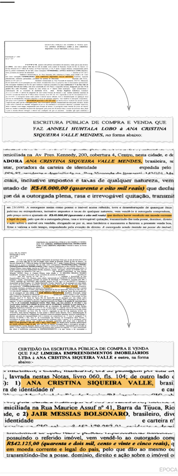 Uma vez vivendo a nova união, ela se transformou em uma ávida negociadora imobiliária, como revela um levantamento de ÉPOCA feito com base em quase 40 escrituras de compra e venda e 20 registros em cartórios no Rio de Janeiro e em Brasília. Do final de 1997, quando se envolveu com o então deputado federal, até 2008, momento do ruidoso rompimento, Ana Cristina comprou, com Jair, 14 apartamentos, casas e terrenos, que somavam um patrimônio, em imóveis, avaliado em cerca de R$ 3 milhões na data da separação — o equivalente a R$ 5,3 milhões em valores corrigidos pela inflação. (…)