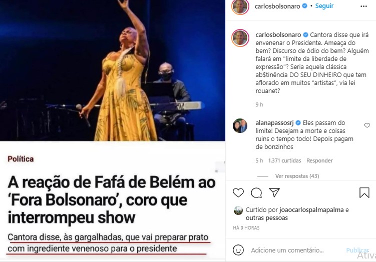 Detalhes do texto narram que após ter seu show interrompido por gritos de “Fora Bolsonaro!”, a artista disse à plateia, “emendando uma gargalhada”, que faria uma maniçoba para o presidente.