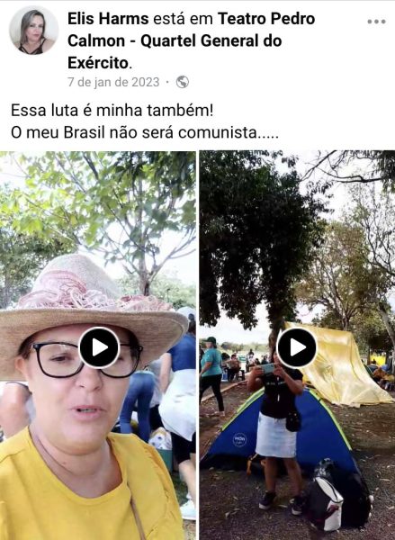 Nas vésperas do ataque terrorista de 8 de janeiro, ela esteve em acampamento no quartel general do Exército em Brasília protestando. Na ocasião, Elisiane publicou dois vídeos e escreveu: “Essa luta é minha também! O meu Brasil não será comunista”.