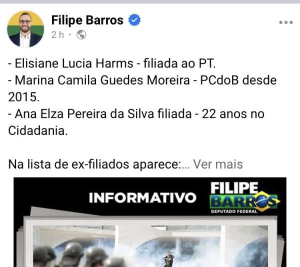 Filipe Barros (PL-PR) compartilhou uma fake news de que petistas teriam se infiltrado entre os terroristas que invadiram a Praça dos Três Poderes, mas se esqueceu que já tirou foto com uma das supostas filiadas ao PT. Segundo um texto do site bolsonarista Revista Oeste, Elisiane Lucia Harms seria filiada ao partido de Lula, mas ela é, na verdade, apoiadora do ex-presidente Jair Bolsonaro.