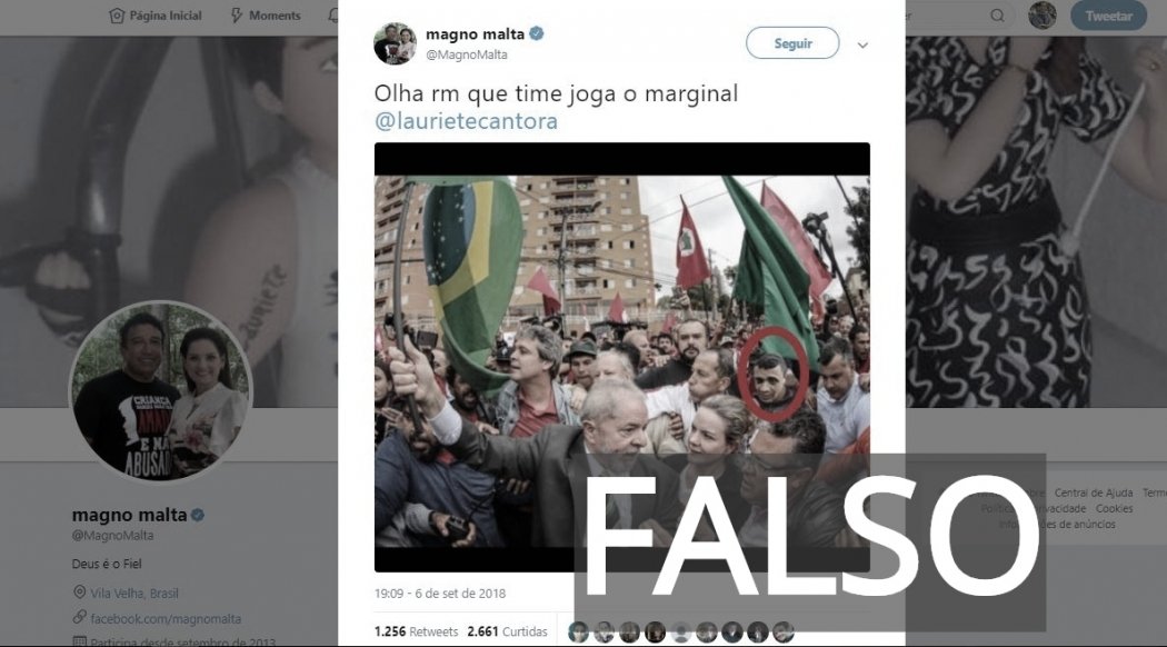 O senador Magno Malta (PR) publicou fake news nas redes sociais. Uma montagem grosseira mostra Adélio Bispo de Oliveira, preso por esfaquear Jair Bolsonaro em Juiz de Fora, num ato com Lula.