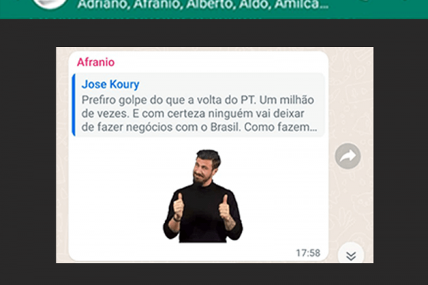 A troca de mensagens em defesa de um golpe de Estado para impedir eventual posse de Lula, trocadas em um grupo de WhatsApp formado por empresários bolsonaristas, repercutiu mal na Faria Lima.