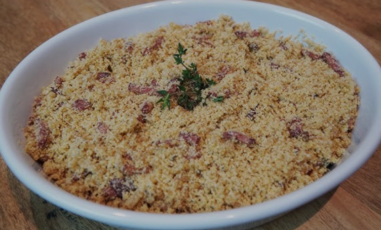 A farinha de mandioca é incorporada para formar a farofa. Sal é ajustado conforme o bacon.