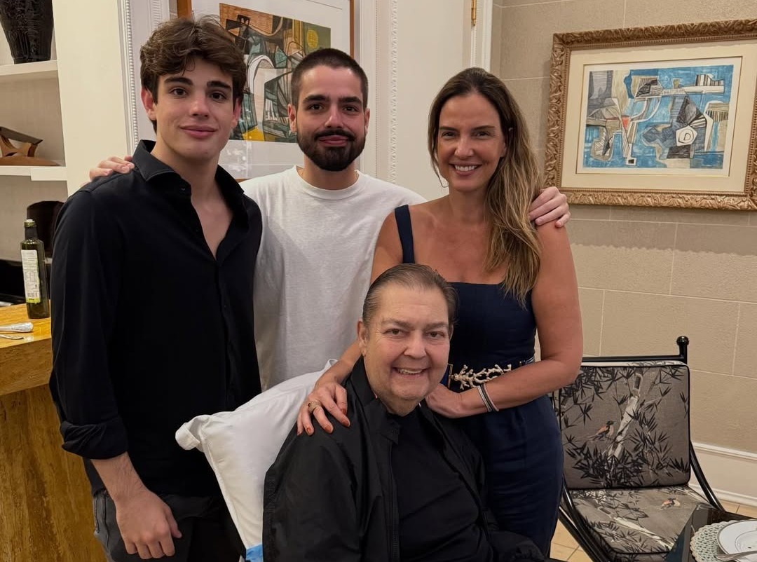 No clique, Faustão surge sorridente ao lado da esposa, Luciana Cardoso, e dos filhos João e Rodrigo Silva. A filha mais velha, Lara Silva, não aparece na imagem, o que foi mencionado pelo aniversariante na legenda.