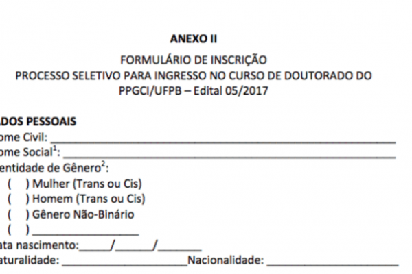As fichas de inscrição para as vagas de mestrado e doutorado do Programa de Pós-Graduação em Ciência da Informação da UFPB (Universidade Federal da Paraíba) saíram do modelo “feminino” e “masculino” e foram ampliadas para incluir outras identidades de gênero.