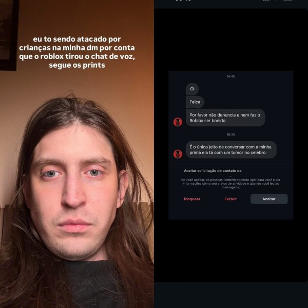 O influenciador digital Felipe Bressanim, conhecido como Felca, afirmou ter recebido ataques e ameaças após mudanças anunciadas pelo Roblox. As mensagens, segundo ele, chegaram por meio do Instagram e teriam sido enviadas por usuários que se identificam como crianças. “Estou sendo atacado por crianças na minha DM por conta que o Roblox tirou o chat de voz, segue os prints”, escreveu.