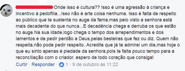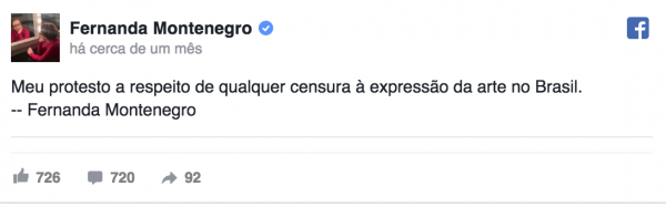 “Meu protesto a respeito de qualquer censura à expressão da arte no Brasil”, diz a publicação, feita em 20 de setembro pela equipe da atriz que administra a sua página. A própria Fernanda não é dada às redes sociais. O tom dos comentários – de ameaça à vida da atriz e marcado por palavras de baixo calão – levou a equipe de Fernanda Montenegro a acionar o Facebook, usando a ferramenta de denúncia disponibilizada no próprio site.