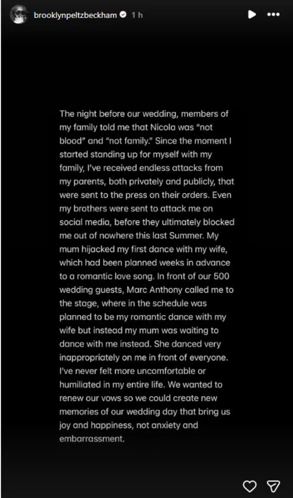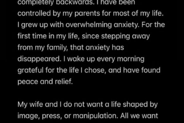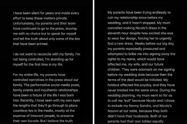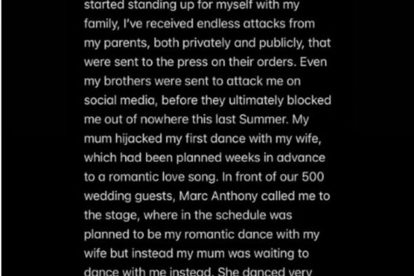 Brooklyn ainda descreveu episódios de conflito envolvendo Nicola e outros membros da família, incluindo situações ocorridas às vésperas do casamento. Segundo ele, parentes afirmaram que a esposa “não era do mesmo sangue” e “não era família”. O primogênito também relatou um episódio envolvendo a mãe durante a festa. “Ela dançou de forma extremamente inadequada comigo diante de todos. Nunca me senti tão desconfortável ou humilhado”, escreveu. Ao encerrar o desabafo, Brooklyn afirmou que ele e a esposa buscam “paz, privacidade e felicidade”, longe de disputas públicas.