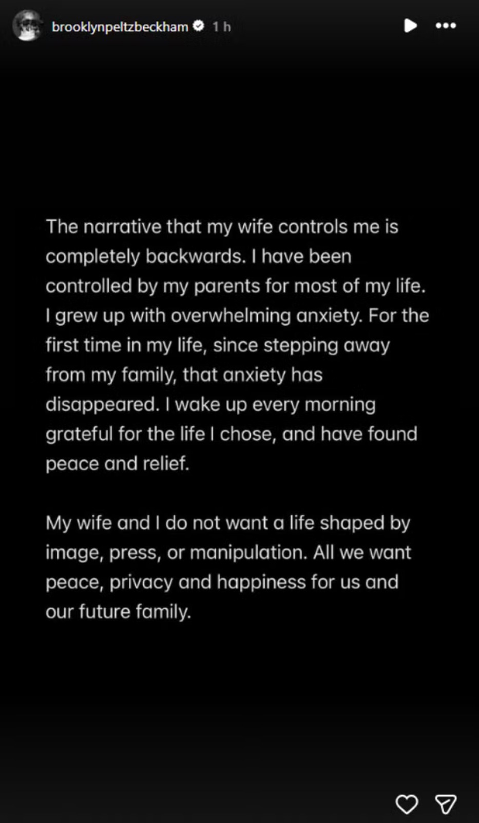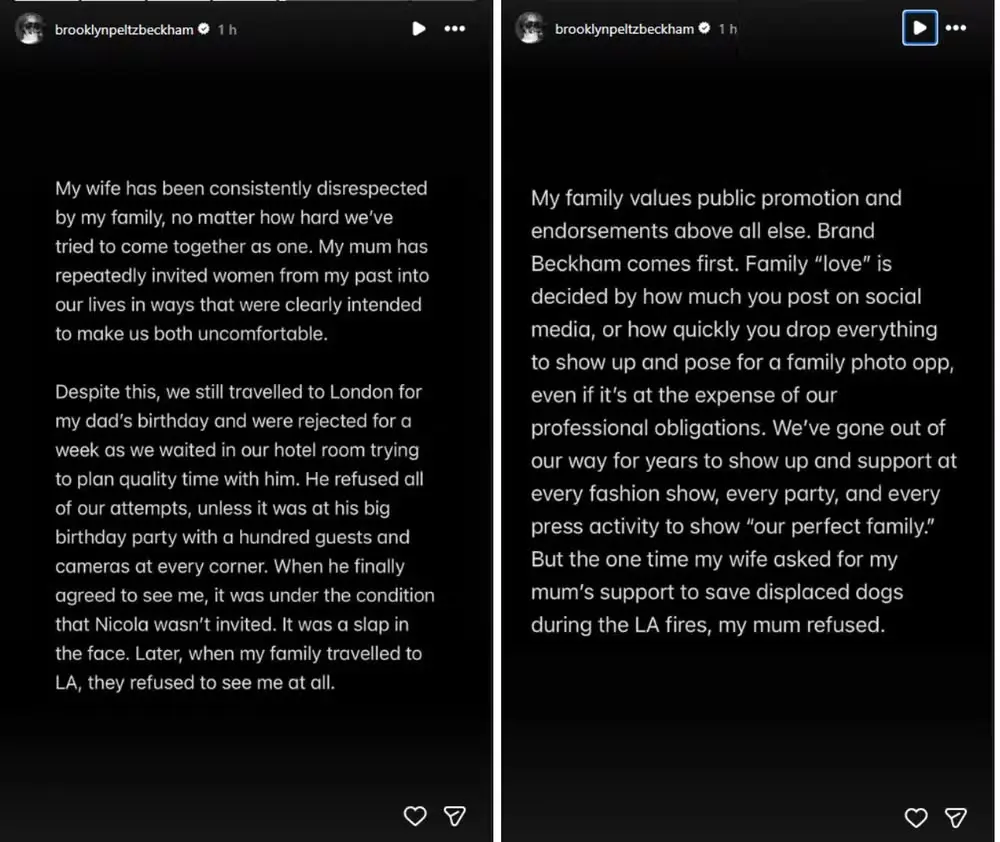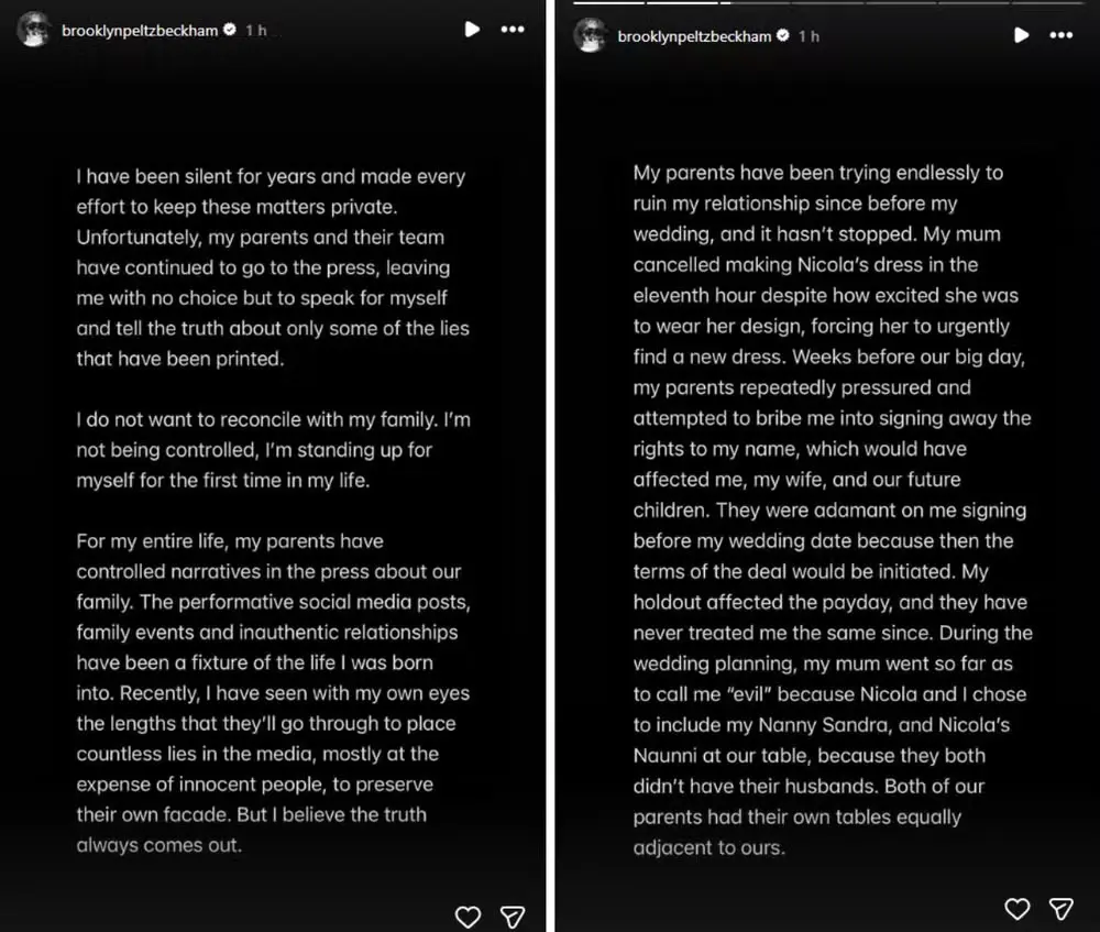 No texto, Brooklyn também rebateu a narrativa de que seria controlado pela esposa, Nicola Peltz, e afirmou que sempre esteve sob influência dos pais. Ele relatou que, antes do casamento em 2022, teria sido pressionado a assinar a cessão de direitos sobre o uso de seu nome. “Meus pais me pressionaram repetidamente e tentaram me subornar para que eu assinasse esse documento, o que teria impacto sobre mim, minha esposa e nossos futuros filhos”, declarou.